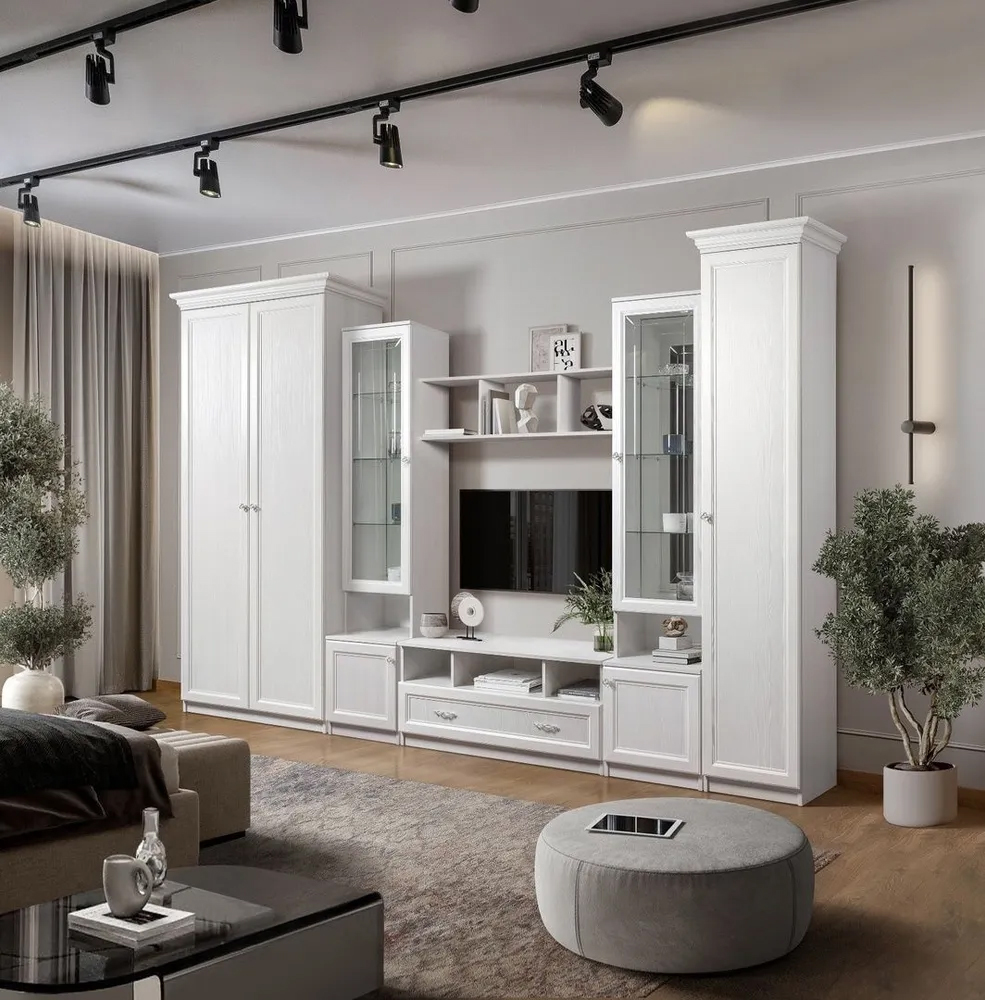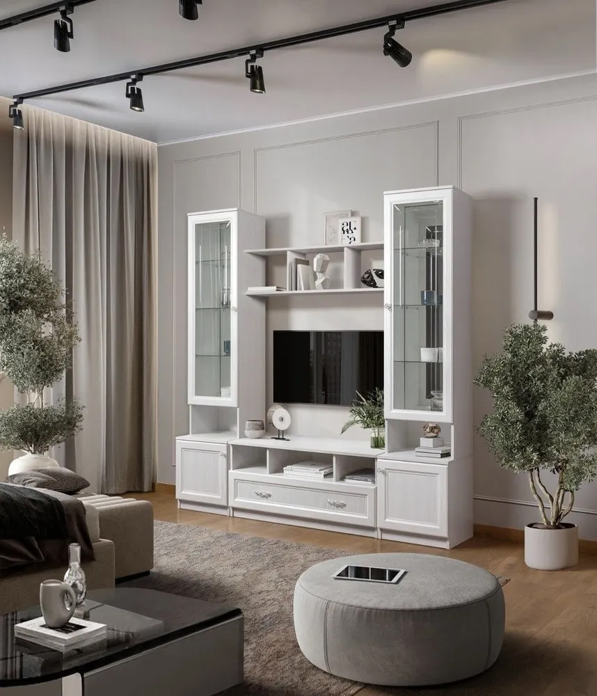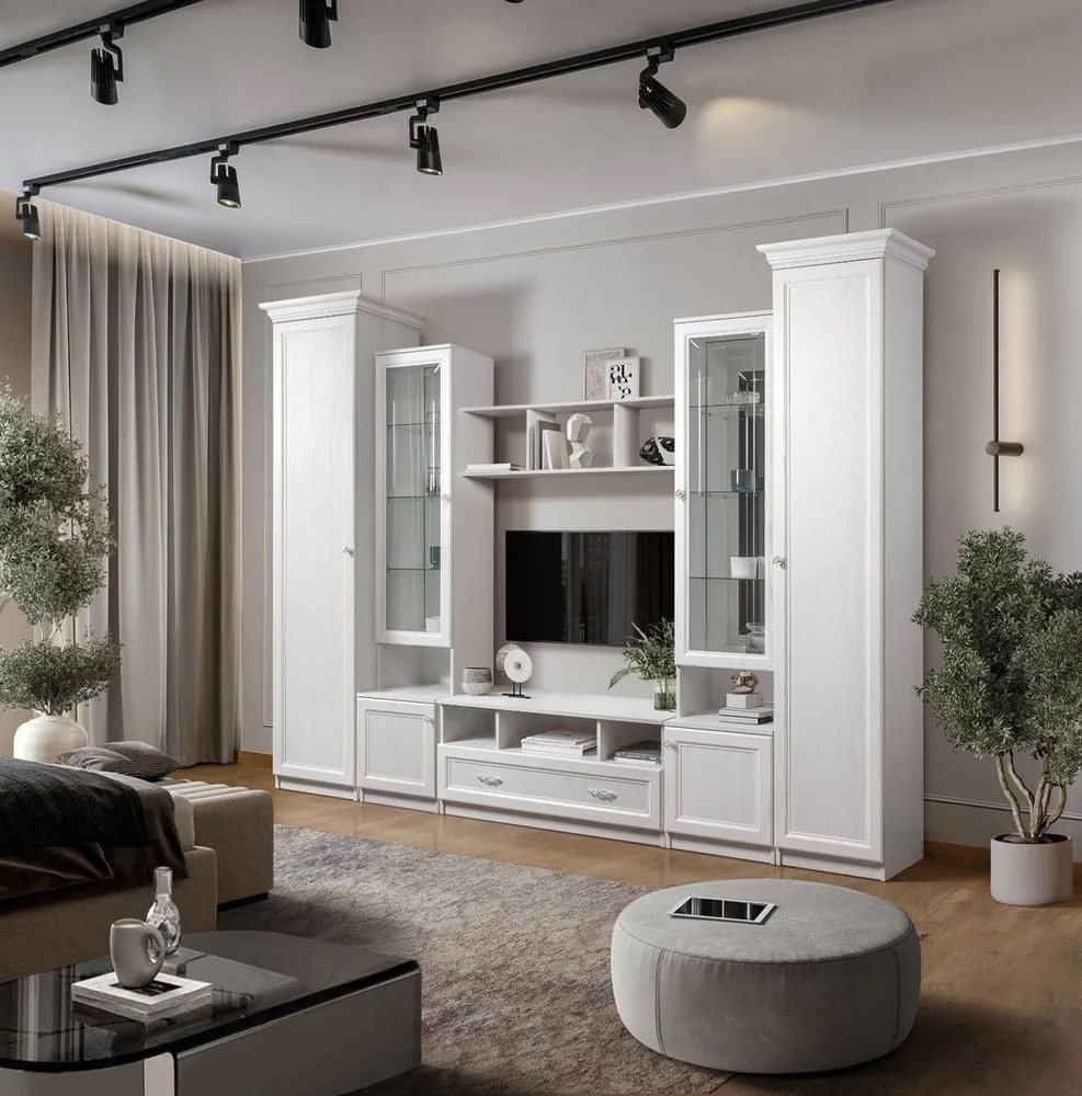 Гостиная ТВ Амели в светлых и темных оттенках подарит вашей гостиной комнате неповторимое очарование. Это удивительно функциональная мебель. В составе гарнитура тумба под телевизор, а также 2 витрины. В витринах удобно разместить самую лучшую хрустальную и фарфоровую посуду. В ящичках в нижней части удобно хранить скатерть и прочие принадлежности для приема гостей.